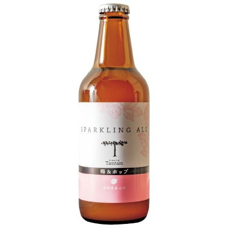 スパークリングエール(高級発泡酒)。4種類の高山村産梅を使用し、特別な技法で梅エキスを麦汁に抽出して造りました。梅酒とは異なる新感覚の「梅のビール」。ビールなのに、さわやかな梅の風味が感じられます。