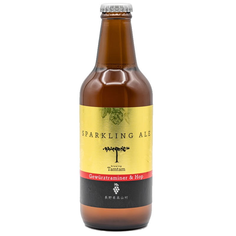 スパークリングエール(高級発泡酒)。高山村産ワインブドウをふんだんに使ったシャンパンのような、ビールのような新感覚エール。品種は、ゲベルツトラミナル。ワインブドウは自家栽培で、ひと房ひと房袋がけすることにより、国内では非常